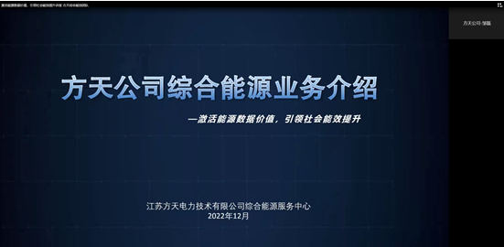 江苏方天电力技术有限公司综合能源服务技术团队成员包括邹磊、仲春林、邵恩泽、吴正勇、刘述波、徐啸等6位专家。首先,该公司综合能源服务中心副主任邹磊高工介绍了方天公司综合能源业务,主要包括基于“数据+应用”模式搭建综合能源服务平台,构建生态圈,服务工业企业与公共建筑,为工业园区、水利行业、钢铁、农业、制备电厂提供综合能源优化与管理。随后团队成员分别对具体业务及成果进行了详细介绍。仲春林高工介绍了江苏省新型电力负荷管理系统;邵恩泽高工介绍了碳服务场景探索及碳核算模型研究;吴正勇高工介绍了工业园区多能互补创新实践与应用;刘述波高工介绍了江苏省重点用能单位能耗在线监测系统;徐啸高工介绍了江苏省公共机构能耗感知与节能管理服务。