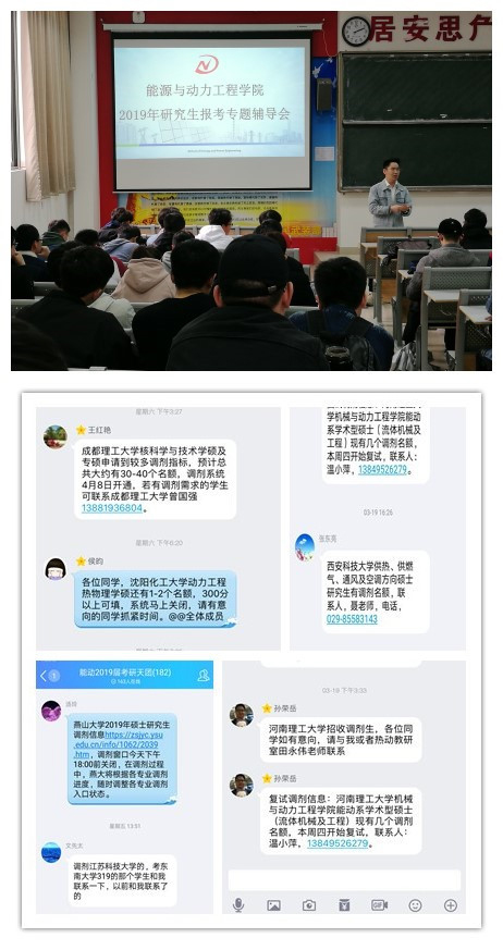 近年来,学院高度重视学生考研工作,制定了一系列考研激励保障措施,为考研学子提供全程化的备考服务。学院党政领导、各系主任、考研指导骨干教师、毕业设计指导老师、辅导员、班主任、班级就业信息员全员投入,七级联动。工作上契合、资源上整合、力量上联合,共同助力考研学生打好这一场“持久仗”、“硬仗”。“线上”建立专题辅导QQ群,充分发挥专业课老师在行业内的人脉和资源,实时发布第一手考研复试、调剂动态。截止目前已累计分享、发送2019届毕业生考研有效信息200余条;“线下”召开考研复试(调剂)专项辅导会、组织老师“一对一”复试辅导,指导学生科学制定有效策略。