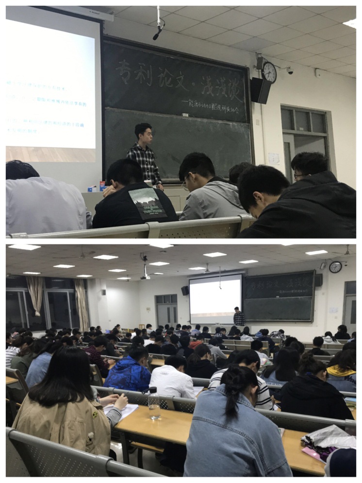 今年的4月26日是第十九个世界知识产权日,为了提升学生科技创新能力和水平,营造浓厚的科研学术氛围,4月22日晚,能源与动力工程学院在东302教室举办了“专利论文•浅浅谈”专题讲座,邀请了该院在专利申报与授权、论文发表等方面取得优秀成绩的学生代表——来自集控162班的何文杰向到会的200多位同学做了一次精彩的交流。