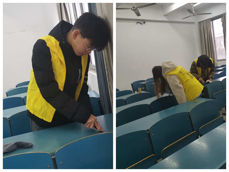 学院组织青年学生以团支部为单位,发挥先进团支部的榜样作用,开展PPT课件制作、上课黑板清洁、上课教室清扫、课堂笔记分享等方面的志愿服务。志愿者提前进入教室,为教师开启电脑及投影仪,减少课前准备时间;课间,志愿者及时清洁黑板,保证教学活动的顺利进行;课后,志愿者整理讲台、打扫课桌,让教室保持干净整洁,并在所有同学离开教室后关闭电灯电源,践行节能减排倡导。