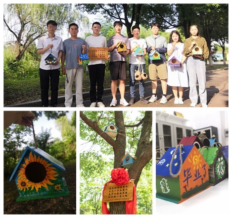 同学们精心对鸟窝进行了创作和绘制,有的描绘出绿色生态校园场景,有的展现出满载希望的“星辰大海”,有的则充盈着浓浓的惜别祝福之情……“选择在树上悬挂、制作生态鸟窝这种方式,一方面是寓意我们曾像雏鸟一样在南工程的怀抱里成长,表达我们对学校和老师的谢意;另一方面,虽然我们毕业离开了学校,但留下的鸟窝替我们守护校园,为美丽校园增添一抹独特的记忆,希望它能够成为南工程特色的景观‘打卡点’,成为学脉相继的标志物,成为家国情怀的见证之所。”毕业生常小琴如是说到。